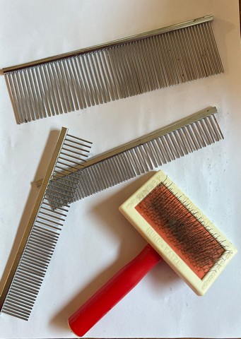 De beste kammen voor katten zijn verrassend simpel: de slickerborstel (hierboven met het rode handvat op de foto) en combikammen, zoals ze worden genoemd; een kam met grove en fijnere tanden.