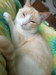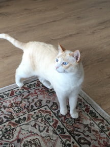 - kleur: wit met crème (bij raskatten wordt deze mooie kleur rood zo genoemd), met heel mooie blauwe ogen