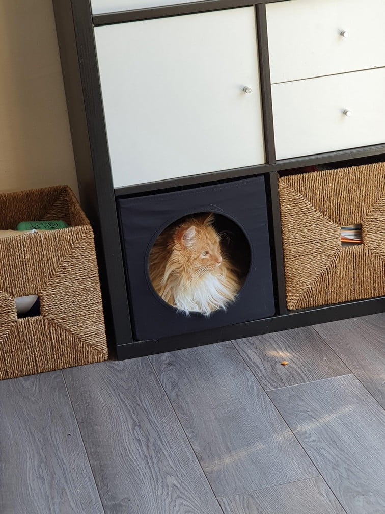 Verder is hij dol op holletjes om in te slapen. Marieke heeft thuis meerdere krabpalen en “huisjes” met holletjes, en hij heeft ze allemaal al uitgeprobeerd. 🙂 Het zou heel fijn zijn als jij ook een mooie, grote krabpaal hebt (of koopt) met een schuilhol erin. Dat zal hij enorm waarderen.