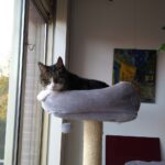 Omdat hij vorig jaar door een hond was gegrepen kon hij niet meer springen, gelukkig had ik nog een trappetje staan en heb die voor mijn bed gezet, Diego vond het geheel vanzelfsprekend en maakte er ook goed gebruik van. Sliep vanaf de eerste nacht op mijn bed. Teal’c deed het goed, kwam ook wel op bed maar bleef grotendeels in zijn paal die ik voor het raam had gezet. Diego wilde ook graag op schoot en na een paar dagen wilde Teal’c dat ook wel. De eigenaresse en ik hielden goed app contact met foto’s.