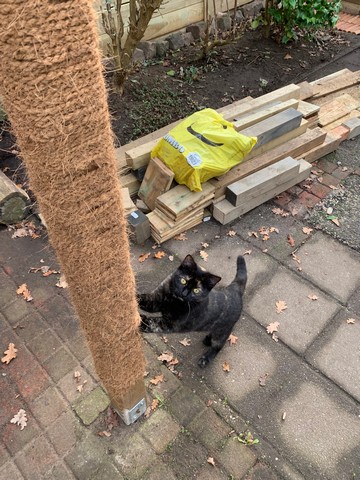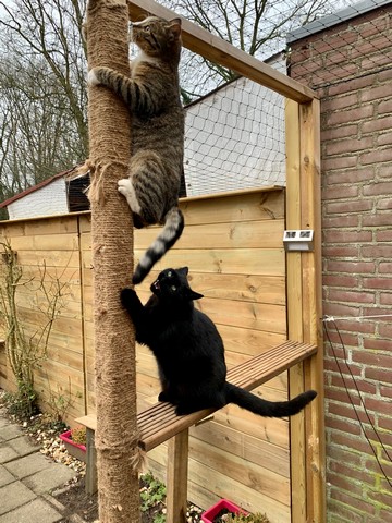 Er zijn baasjes die in het geheel geen ‘krabprobleem’ hebben binnen. Hun katten krabben hun nagels niet veel uit – of doen het hoofdzakelijk buiten. Het is voor een kat heel fijn om in zijn eigen tuin (of op het balkon) ook krabmogelijkheden te hebben. Ik heb 3 palen in de tuin omwikkeld met sisal-touw. Een van de palen is echt bedoeld als klimpaal en daar gebruiken de katten het ook voor: om bovenop hun ligdakje of in de buiten-hangmat te komen. Ze gebruiken alle krabpalen om hun nagels aan uit te krabben.