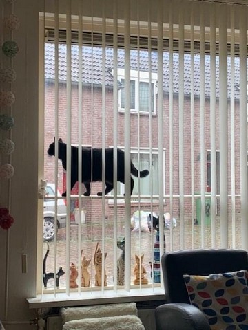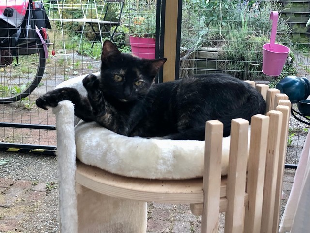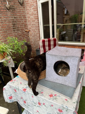 Bij mooi weer zet ik spullen van binnen in de tuin, dat vinden de katten geweldig! Dit materiaal kan niet tegen vocht/regen, dus tegen de herfst zet ik het weer binnen.