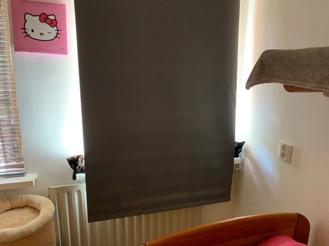 aluminium jaloezieën heb ik in een van de slaapkamers boven. In deze slaapkamer wenden Koffie en Friet als net geadopteerde kittentjes aan mij en aan mijn huis. Aluminium jaloezieën zou ik niet aanraden bij kittens. Koffie en Friet hebben er een mooi kunstwerk van gemaakt door erin te bijten. 🙂 Je kunt ze natuurlijk wel helemaal omhoog halen om de jaloezieën te beschermen tegen de katten, maar dat is niet altijd praktisch. We zaten midden in een hittegolf toen ik Koffie en Friet adopteerde dus ik kon de jaloezieën toen niet omhoog doen, met een kamer op het zuiden!