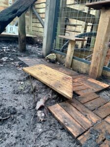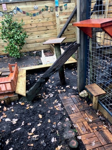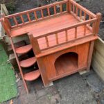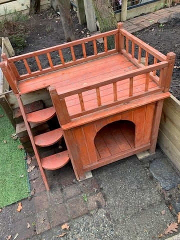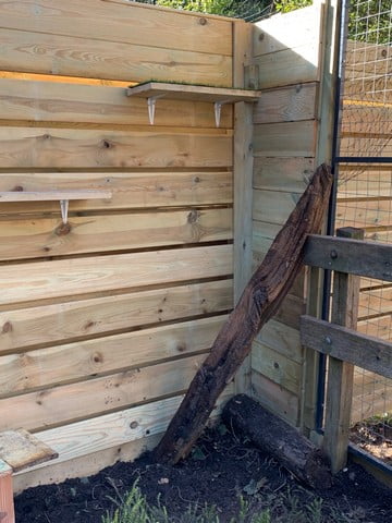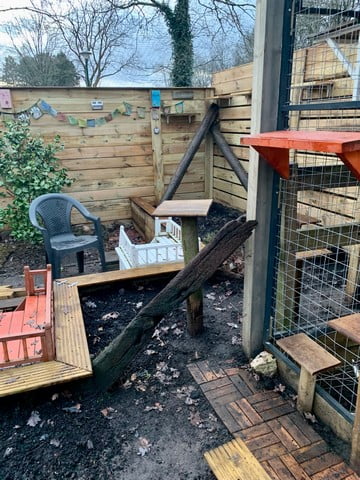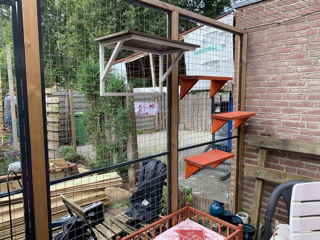 het afdakje en de krabpaal. Over de plank ervoor kunnen Koffie en Friet nog lopen en ze kunnen ook op het dakje liggen