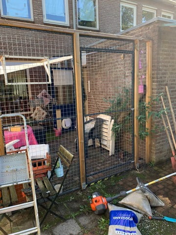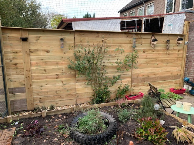 Ik heb de daad bij het woord gevoegd en in september 2022 is de start gemaakt om de gehele tuin catproof te maken. Dat was voor mijn tuin een enorme operatie. Alle schuttingen en borders waren heel erg oud en zo rot als een mispel. Dat is allemaal vervangen. Vervolgens is er speciaal kattennet van Nettenlijn uit Cuijk over de gehele tuin gespannen.