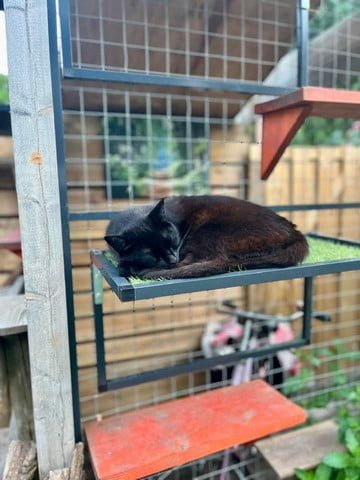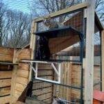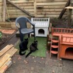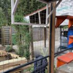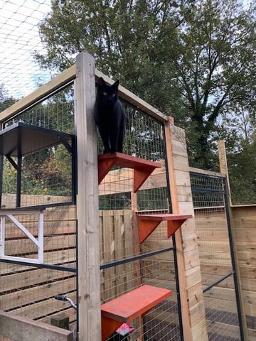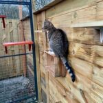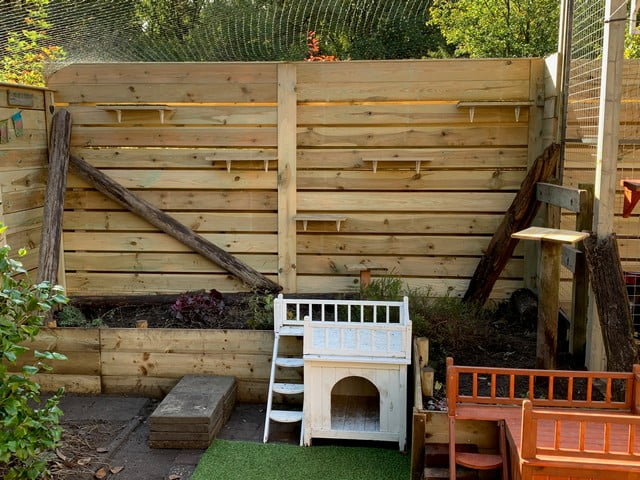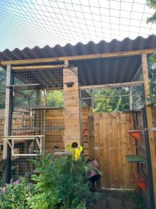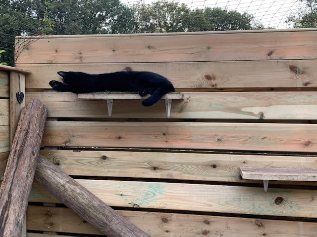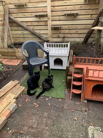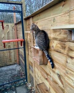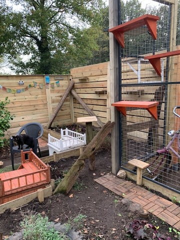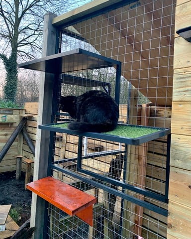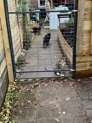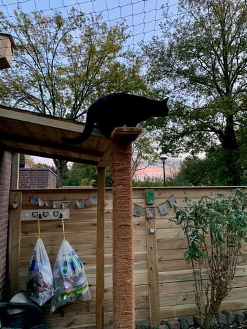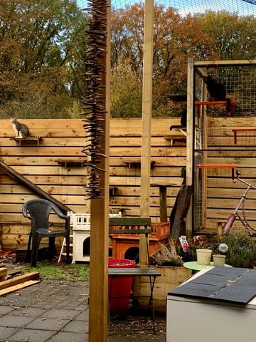 De kattenren is niet groot (en kattenliefhebbers willen toch altijd méér voor hun katten) 🙂 maar het was wél een fantastische buitenplek voor de katten, met direct zonlicht, frisse buitenlucht, een compostkuil om muizen in te vangen, klim- en krabpalen én hoge uitkijkposten/ligplaatsjes om alles te kunnen zien wat er in het aangrenzende bos gebeurt. De katten hadden toegang tot de ren via het openstaande raam van de huiskamer of vrije toegang via het ‘slimme microchipkattenluik‘ van Sure Petcare in de achterdeur.