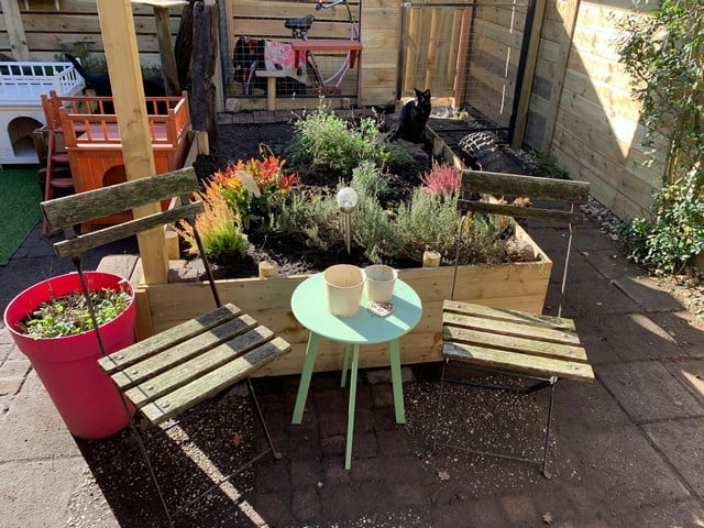 *in mei 2023 wilde ik de tuin echt helemaal mooi, af en compleet hebben, en toen heb ik dan ook inderdaad de voet voor de regenton gekocht. Maar…die is lager dan het houten standaardje, dus moet de afvoer van de regenpijp eerst worden aangepast voordat ik de voet eronder kan zetten! Hij staat nu op een plek in de tuin (op de foto hieronder tussen de stoeltjes) en de poezen denken dat het hun ligplek is. 🙂