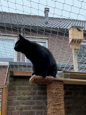 op de kattenren is omzoomd zwart kattennet (P.E., 1,2 mm) gemonteerd. Maaswijdte 5. De lengte was een strakke maat: 3,64 meter lang x 4,05 meter breed. Dit paste exact en ik heb hiervoor € 41,25 incl. btw voor betaald (tarief 2021). Ja, écht zo weinig!