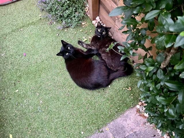 Het was wel even spannend. Zouden ze nu dan eindelijk tevreden zijn? Of zou Koffie (als gevonden straatschoffie) nu elke avond bij de poort klaaglijk gaan huilen omdat hij eropuit wilde? Het bleek genoeg, gelukkig. 🙂 Het kunnen rondrennen, met nog meer mogelijkheden om te klimmen en te springen, was wat ze nodig hadden. Ze hebben nog geen enkele ontsnappingspoging gedaan en liggen dag en nacht volmaakt tevreden te slapen in de tuin. Buiten het vele spelen en rennen om natuurlijk. 🙂