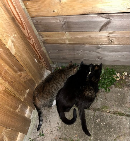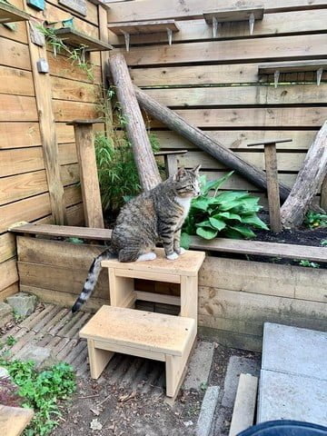 Kleine verrijkingen voor de katten blijf ik kopen. Dit trapje van steigerhout (eigenlijk bedoeld voor binnen) vinden ze geweldig.