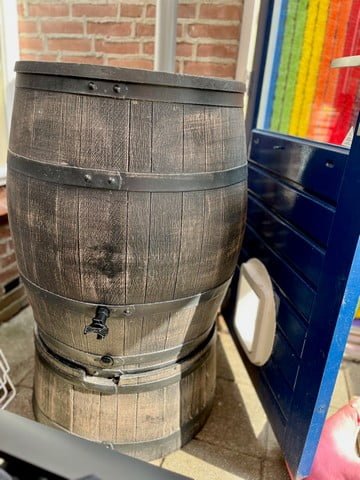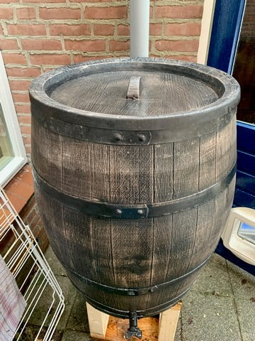 Iedereen denkt dat de regenton van hout is, maar het is kunststof! Dit is de Roto 240 liter bruin. Ik vind ‘m supermooi. Er is een bijpassende voet (regentonstandaard) te koop en dat is natuurlijk heel erg fraai, maar met een prijs van (los) € 92,- (tarief 2023) heb ik daarop bezuinigd. Dat vond ik echt te gortig worden. Misschien koop ik ‘m ooit nog wel een keer in de toekomst*. Er is voor nu door de vakman een voet gemaakt van hardhout in combinatie met gewoon hout. Tip: boor 2 piepkleine gaatjes in het deksel van de regenton, als hij niet onder een overkapping staat. Het deksel is behoorlijk diep en er blijft anders veel water op staan.