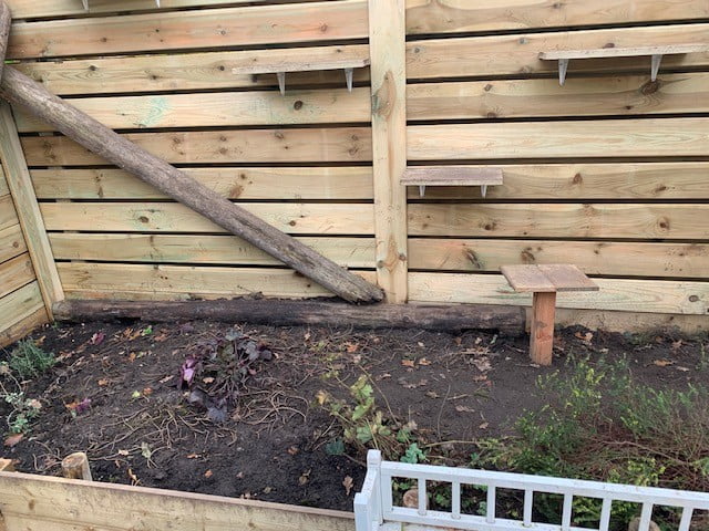 In dit bericht heb ik al veel informatie gegeven over verrijking; wat het is en hoe je de leefomgeving van je kat binnen én buiten verrijkt. Verrijking is alles waar een kat gelukkig(er) van wordt en wat een kat helpt zijn natuurlijke gedrag uit te oefenen (krabben, klimmen, slapen, zich veilig voelen, ruiken, etc.). Ik heb hier binnenshuis, maar ook zeker in de tuin, altijd veel aandacht aan besteed. Onderstaand foto’s van verrijking voor de katten in ‘de nieuwe tuin’.
