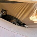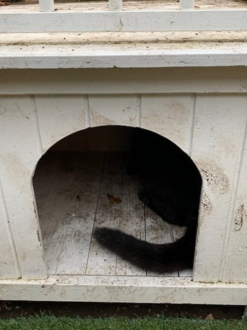 Het is echt niet te geloven dat ze het prettig vinden, maar in juni 2023 was het al ongelofelijk warm en tikten we meerdere keren de 30 graden aan in Cuijk. En waar liggen ze dan? In holletjes! Het kattenhuis Peekaboo is van melamine hout en eigenlijk voor binnen. De vilten holletjes (Trixie kattenholletje Anton) zijn eigenlijk voor IKEA Kallax-kasten. Beiden kunnen ook prima in de tuin met mooi weer en ze genieten er heel erg van.