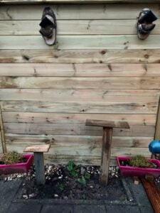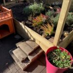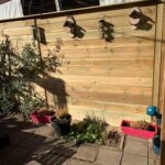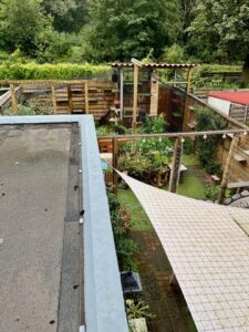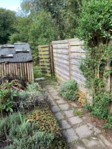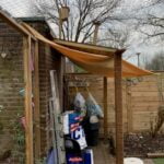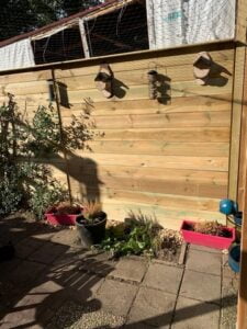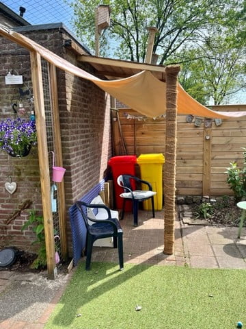 In november 2022 is het door mij gewenste dakje geplaatst. 🙂 Ik wilde toch weer een dakje op deze plek om mijn oud papier onder te stallen (wij moeten dit een maand opsparen en zelf gaan inleveren op een centraal punt). Omdat ik last heb gehad van ratten in de tuin die op de zakken plastic af kwamen, heb ik een kapstok aan de schutting gemaakt om de zakken aan op te hangen, het schijnt dat ratten hierdoor toch wel ontmoedigd worden. 🙂