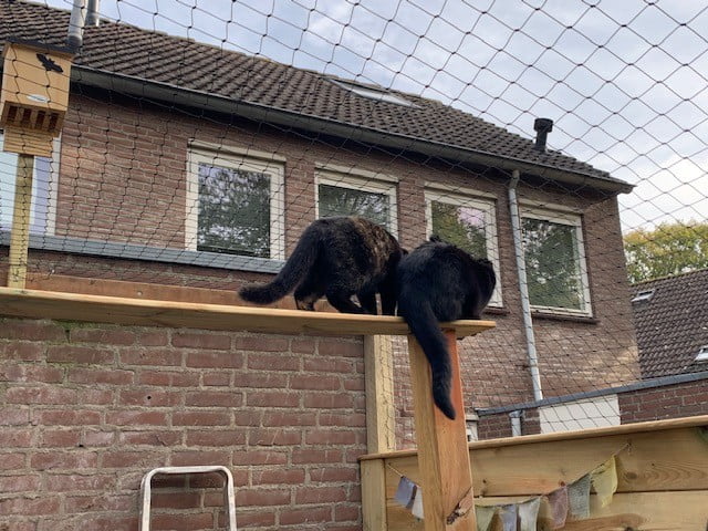 Geen haar op mijn hoofd die eraan dacht om mijn geliefde asielkatjes los buiten te laten lopen. Maar wat dan? Hoeveel verrijking ik ook al had aangebracht in de kattenren, het was gewoon niet genoeg voor ze… Koffie zat iedere avond met een zielig stemmetje te “huilen” voor de deur van de kattenren. Beiden hebben verschillende ontsnappingspogingen gedaan en het is ze ook allebei een keer gelukt om ergens een opening te vinden en uit de kattenren te komen. Daar waren ze de hele dag mee bezig, om te kijken hoe ze uit de ren konden ontsnappen. 🙁 Ik had geen moment rust met zulke acties steeds. De kattenren is natuurlijk niet groot, maar ik had in eerste instantie nog zoiets van: nou, dit is groter dan een gemiddeld balkon, jullie mogen in je pootjes knijpen! Ze zullen er vast wel aan wennen dat dit ‘hun buiten’ is.