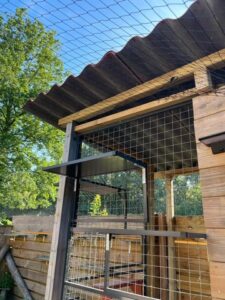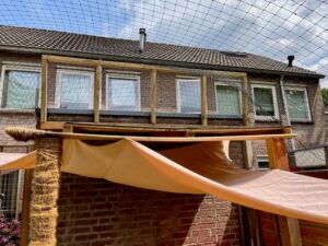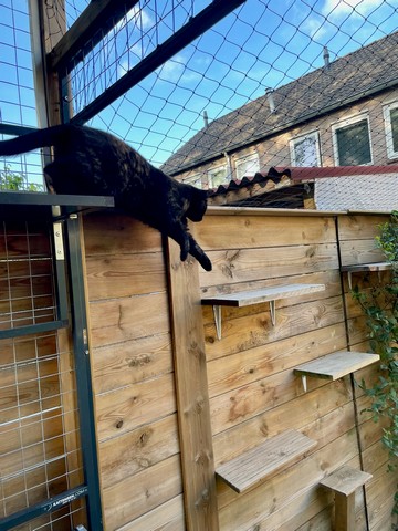 Ik had al een heerlijk verrijkte kattenren van 3.65 x 4.05 meter. Deze is gerealiseerd door panelen te plaatsen tussen de twee (bestaande) muren. De panelen komen van Kattenren.com in Best en had ik tweedehands overgenomen. Het ‘dak’ is omzoomd kattennet van topkwaliteit, van Nettenlijn in Cuijk, en is op maat gemaakt voor deze ren.
