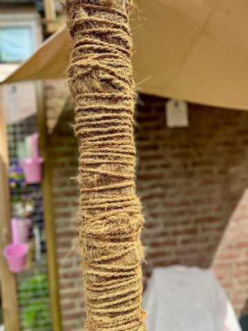 ook geen leuk karweitje om te doen – en om deze paal zit maar liefst 100 meter (!) kokostouw! Maar ik wist dat ze zo’n klimpaal helemaal geweldig zouden vinden. Het is belangrijk te zorgen voor een overkapping of bescherming tegen weersinvloeden; sisal en touw gaat anders vroeg of laat rotten in de regen. Er is een afdakje gekomen, maar ik wilde de katten niet de klimmogelijkheid ontnemen, dus het touw is nu niet beschermd tegen regen. Ik zal op een bepaald moment het touw moeten vervangen als het gaat rotten. Ik vond dit touw een mooie kleur en van mooi en fijner materiaal dan sisal. Ik heb het gekocht bij bol.