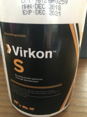 - Virkon S. Dit desinfectiemiddel wordt in professionele omgevingen gebruikt waar met dieren wordt gewerkt. Reinigen en desinfecteren in één handeling! Virkon®S heeft onafhankelijk bewezen zeer effectief te zijn tegen meer dan 100 virusstammen in 22 virusfamilies, 400 bacteriesoorten en meer dan 100 soorten schimmels. Deze lijst van bewezen werkzaamheid bevat o.a. het Canine parvovirus, Kattenleukemie-virus, salmonella, E-coli en het van dierlijke oorsprong MRSA
