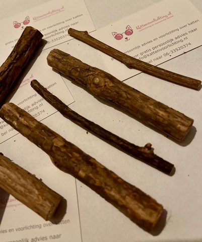 De dunne kauwstokjes matatabi zijn bij veruit de meeste katten favoriet. Ik verkoop die dan ook al jaren. Op speciaal verzoek heb nu ook de dikke kattenkauwstokjes in het assortiment opgenomen. Want sommige katten vinden die lekkerder. Maar ook veel baasjes vinden de dikke stokken een stuk handiger (om onder de kast uit te krijgen bijvoorbeeld). 🙂 De dikke matatabi-stokjes zijn ook geschikt voor katten zoals mijn kater Wijntje, die de dunne stokjes zo fanatiek te lijf gaat, dat hij ze helemaal aan stukjes kauwt! (filmpje)