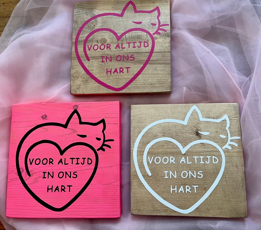 Dit mooie, handgemaakte bordje is exclusief te koop bij Kattenvoorlichting.nl. De bordjes zijn er in verschillende kleuren en met diverse teksten; dit is het bordje met de tekst ‘voor altijd in ons hart’. Ook een lief cadeau om iemand te steunen wiens kat is overleden.