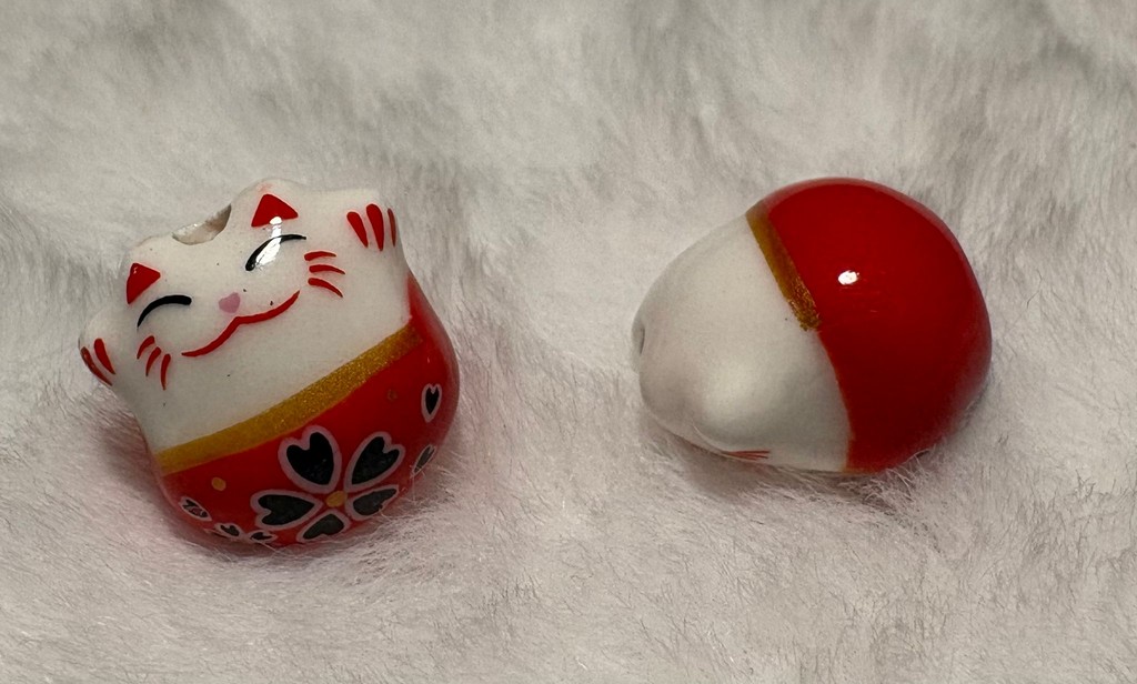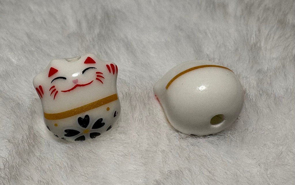 Er zijn mensen die zelf sieraden maken van de gelukskatjes. Ik weet van tevoren nooit waar de gaatjes zitten als ik ze bestel. Er zijn katjes met gaatjes aan de zijkanten en er zijn katjes met gaatjes aan de boven- en onderkant. Geef in de opmerkingen van je bestelling aan als je er een sieraad van wil maken en waar de gaatjes moeten zitten, dan laat ik het je weten of ik die heb!