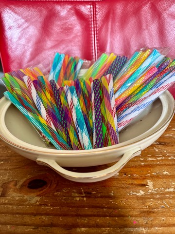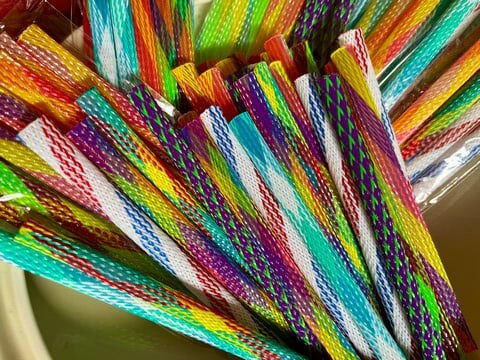 De rietjes zijn flexibele, gevlochten nylon buisjes. De buisjes zijn ca. 13 cm lang en hebben een doorsnede van 0,8 cm.