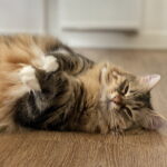 Als hij ergens bij komt liggen gaat hij al gauw met z’n buik omhoog liggen en hij vind het prima om over zijn buik geaaid te worden, als hij maar aandacht krijgt is het al gauw goed. 😉