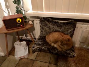 Ook hier is hij gek op de drinkfontein en hij drinkt er goed uit. Het model in de vorm van een kraan (de Pioneer Pet Swan Fountain, te koop bij Zooplus) vindt hij het leukst. Zijn baasjes hebben deze thuis ook en daar hebben we nog een grappig filmpje van gekregen, want in het begin was hij er nog wat onhandig mee, en stroomde het water steeds over zijn hoofd. 🙂