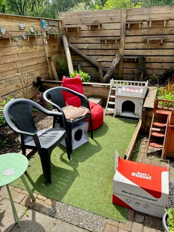 Het is niet altijd makkelijk en praktisch om iets naast de achterdeur te plaatsen, het kan erg in de weg staan. Marieke heeft twee krukjes van de Kringloopwinkel naast de achterdeur gezet. Zo kunnen de katten er even veilig achter blijven zitten en de omgeving observeren zodra ze door het kattenluik de tuin in stappen