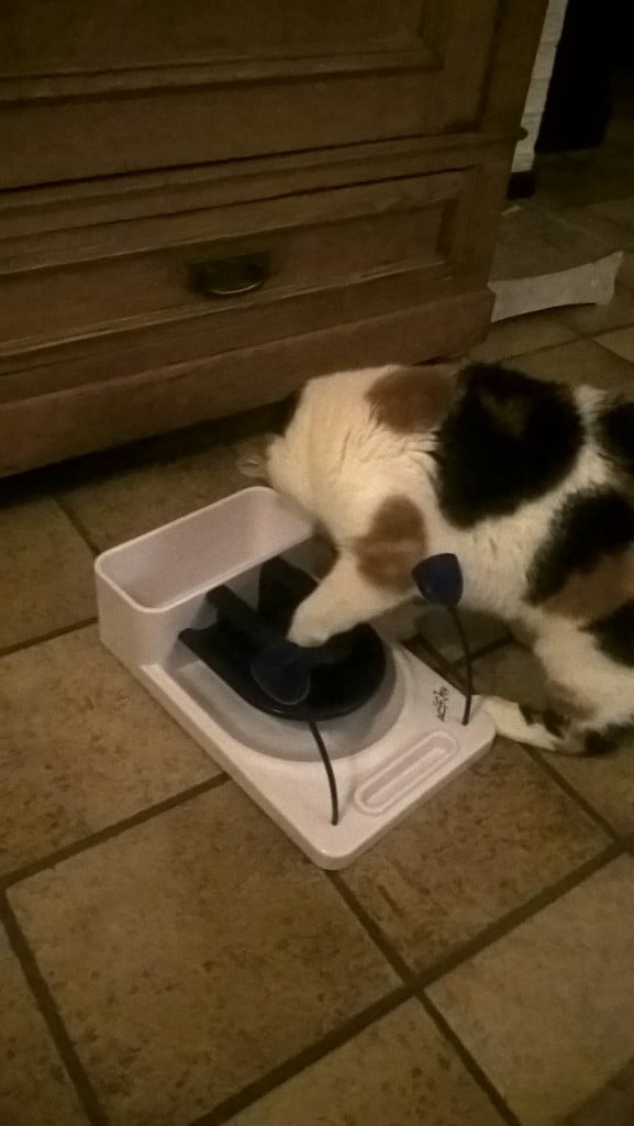 Met veel dank aan Ellen, die deze tip gaf op onze Facebookpagina: “Deze vinden wij de leukste (tot op heden). Net zolang wiebelen met de pootjes tot er een brokje uit komt. En deze geeft dus ook meteen wat lichaamsbeweging. De brokjes gooi je er boven in en dan moeten ze door een doolhof voor ze er uit komen aan de zijkant. Het is eigenlijk voor een hond, maar doordat het roze gedeelte geen hard plastic is (maar een beetje rubberachtig) werkt het voor de kat ook prima. We spelen er vaak samen mee, om de beurt laten wiebelen. Het heet: dog treat maze van Nina Otterson (nog steeds te koop, alleen de kleuren zijn anders nu).”