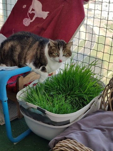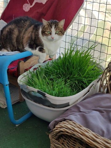 • boots een natuurlijke omgeving na op het balkon door er bakken of bakjes neer te zetten met planten en natuurlijke materialen. Een geweldige tip van onze trouwe Facebookvolger Inka: kattenbakken met kattengras! De foto’s van Inka en haar knappe katje (klik op de foto voor een vergroting). Belangrijk: zet kattengras dat je zelf maakt van gerst, rogge, haver of tarwe NOOIT in je tuin! Al deze grassoorten maken heel nare grasaren die jouw kat in zijn bek, ogen, oren of zelfs vast in de huid kan krijgen. Bijna altijd moet de dierenarts eraan te pas komen om een grasaar te verwijderen!