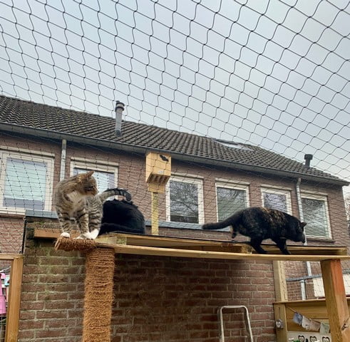 In het voorjaar van 2023 kwamen Koffie en Friet goed in de rui – en niet zo’n beetje ook! Koffie is eind mei een hele dag niet lekker geweest van een haarbal. Ik zag het ’s morgens al toen ik beneden kwam: hij voelde zich niet goed. Hij kwam me niet huppelend begroeten, praatte de hele dag niet en lag erg lusteloos op een kattenplankje te slapen. Hij wilde niets eten, ik heb hem van alles aangeboden de hele dag door. Pas tegen de avond hoorde ik het bekende: “ik-moet-overgeven-miauwtje”. Wat een opluchting. Hij braakte een indrukwekkende haarbal op en binnen een uur was hij weer zijn oude, speelse zelf. Toen dacht ik: hier moet ik iets extra’s voor doen.